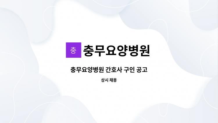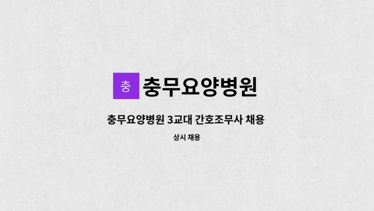 충무요양병원 조리실에서 함께 일하실 조리원분을 모집합니다. 병원/학교 및 시설등 단체급식소 유경험자 우대. 근무조건 : 월 10회 휴무(일요일/공휴일 교대 근무) 근무시간 : 오전 6시 ~ 오후 6시 30분까지 (중간 휴게시간 있음) 복리후생 : 정규직, 4대보험, 연차유급휴가, 퇴직연금 등 채용상담 및 문의 : 영양실장 055) 640-3090