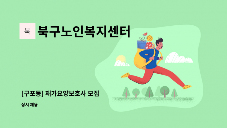 - 근무지 : 주례1동행정복지센터 인근 - 대상자 : 4등급 80대 여자어르신 - 근무시간 : 주5일 / 09시~12시(주5일, 3시간) - 일상생활 및 가사지원 - 시급 : 12,100원 * 지원문의 : 북구노인복지센터 박애경 010-****-**** (*개인정보가 자동 블라인드 됩니다.) * 실제 서비스 제공기간에 따라 임금을 계산하여 지급하는 형태로 채용 시 근로자마다 주 소정 근로자마다 주 소정근로시간이나 임금, 근무(예정)지 등에 차이가 있을 수 있음.