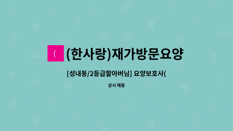 -요양보호대상자: 4등급 할아버님(93세) -근무지: 성내동 -근무시간:15:00-18:00(주5일/ 월~금, 1일 3시간 근무) -직무내용: 일상가사지원, 산책동행, 병원동행 등 -장기요양급여: 시급12,100원 -문 의: 010-****-**** (*개인정보가 자동 블라인드 됩니다.)