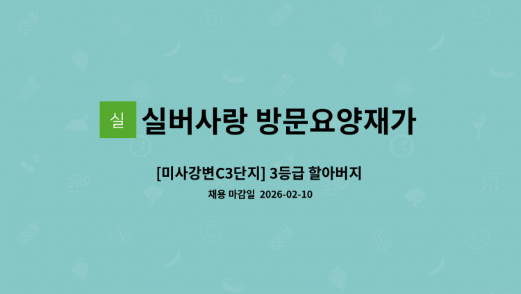 [덕풍동 휴먼시아새뜰마을] 4등급 여자어르신(독거) 케어 요양보호사 모집 - 거동가능, 일상생활지원, 깔끔하시며 인품 좋으심 - 주3일 (월/수/금) 12:00 ~ 15:00 - 시급 12,150원