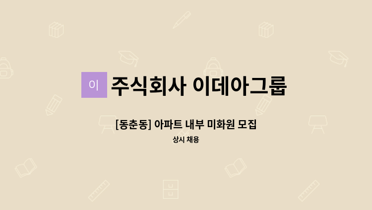 - 아파트 내부청소 - 신주있음(신주 중앙은 본사에서 지원) - 월급: 1,264,040원 - 주5일 07:30~13:00(휴게 0.5h) - 지원문의 010-****-**** (*개인정보가 자동 블라인드 됩니다.)