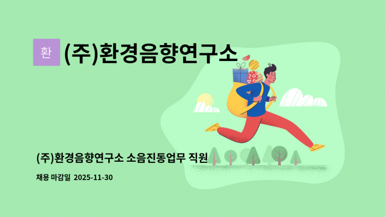 (주)환경음향연구소 공동주택팀에서 함께 할 인재를 채용하고자 합니다. 성실함과 열정을 가지고 저희 회사와 함께 성장해나갈 분은 신청해주세요.