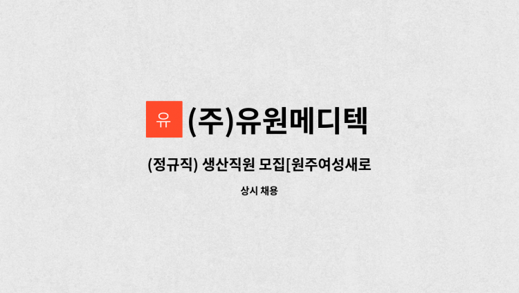 ㈜유원메디텍은 2003년에 설립된 회사로 자본금 9억원 사원수 15명 규모의 고용노동부에서 선정한 강소기업입니다. 강원 원주시 문막읍 동화공단로 147-1 (동화리)에 위치하고 있으며, 수술용 의료기기 제조, 판매사업을 하고 있습니다. ★ 의료기기 조립하는 간단한 업무입니다.
