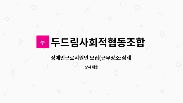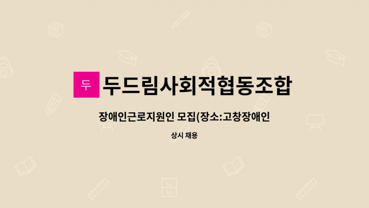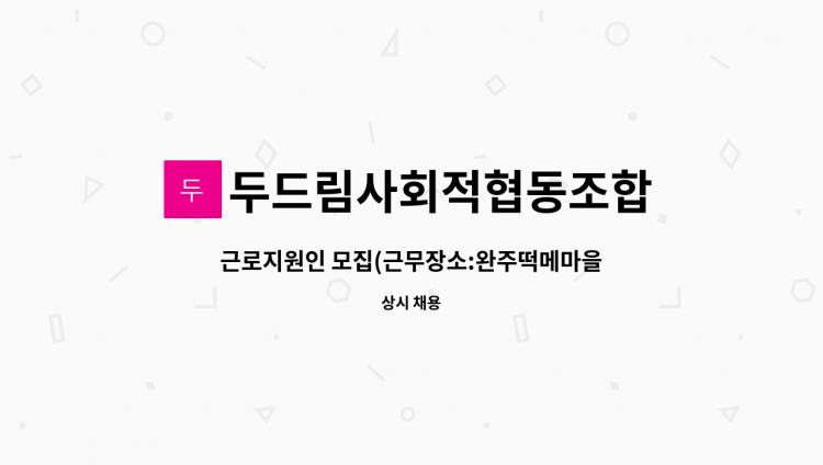 두드림사회적협동조합에서는 장애인근로자 근로지원인을 모집합니다. - 근무장소 : 희망찬코리아 (전주시 삼천동) - 근무시간 : 오후12시~오후8시(8시간) - 근무내용 : 남성 탈의실 정리 및 탈의지도, 운전지원 등 - 주휴수당 지급