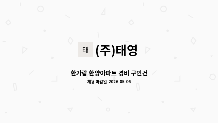 - 명학역부근 안양씨엘포레자이 아파트 단지 내 경비원의 소관업무 관리/통제 단지내 각종 긴급상황 발생시에 대한 조치 업무 등을 수행 * 근무형태 : 월~금 09:00~18:00 - 월급: 297만원 - 경비 신임교육 이수 필수, 경력자 우대 - 이력서 팩스 송부