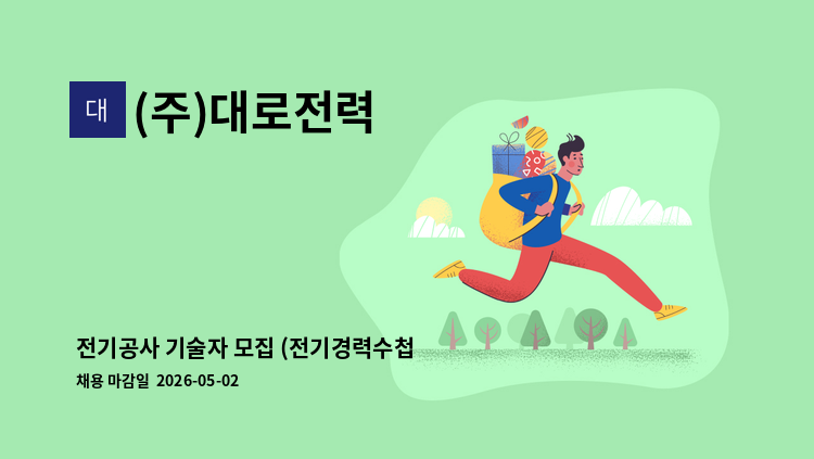 * 담당업무 - 전기공사 현장 공무 * 지원자격 ㆍ경력 : 경력(년수무관)자 우대 * 급여 - 연봉 5,200만원 ( 퇴직금 별도/ 출장 시 숙식 제공) * 우대사항 ㆍ자차소지자 ㆍ전기공사기사, 전기공사산업기사 ㆍ해당직무 근무경험