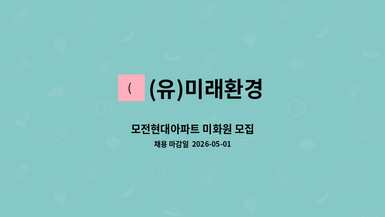 - 하마비마을 동부센트레빌 아파트 경비원 모집 - 격일제근무(07:00-익일07:30) - 급여 : 월 241만원 이상 - 사대보험, 연차, 퇴직금 지급 - 이력서 휴대폰 전송 후 면접진행 - 이력서, 경비교육이수증(사본), 마스크착용(미착용시 면접불가) _ 채용관련 문의 : 010-****-**** (*개인정보가 자동 블라인드 됩니다.)