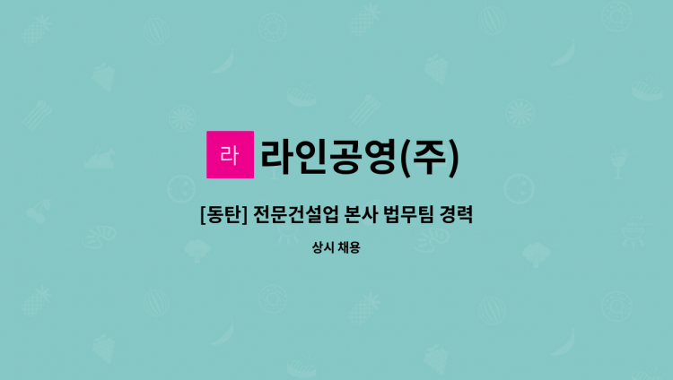 담당 업무 ㆍ 공사 담당자 ㆍ 근무 부서 : 토목부 ㆍ 근무 지역 : 동대구역 인근 (신천동 328-1) ㆍ 근무 기간 : 현장 종료 시 까지 우대 사항 ㆍ건축/토목/조경/도시공학 ㆍ토목기사, 토목산업기사, 토목초급기술자, 건설안전기사 ㆍ 운전 가능자 ㆍ 차량 소지자 ㆍ해당직무 근무 경험 ㆍ기숙사 생활가능자
