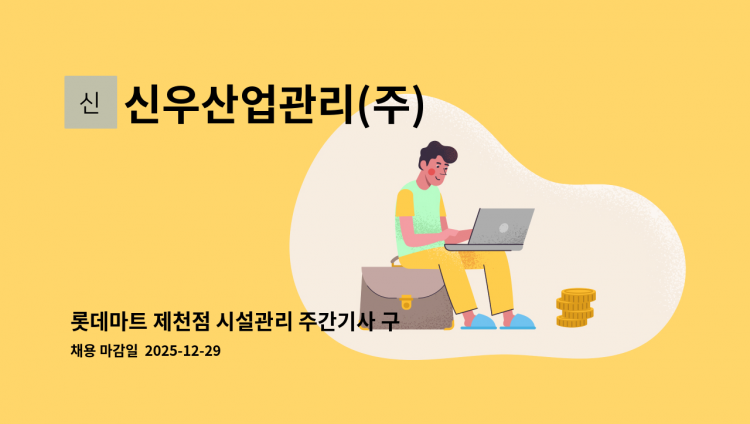 1. 롯데 마트 서초점 시설관리 기사 구인(일근/부소장) 2. 근무형태 - 일근 3. 급여 270만원 4. 기계설비유지관리선임대상자(냉동공조 기사 등), 전기 자격증 소지자 우대 5.근무지 롯데마트 서초점 - 퇴직금 연차수당 별도