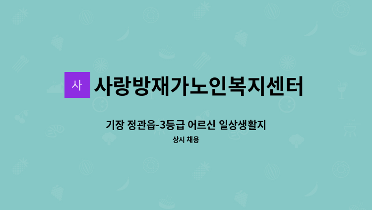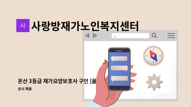 ◈ 요양보호사 모집 *대상자 : 4등급 할머니 *근무시간 :13:00~16:00/주6일 (18시간) *직무 : 병원동행(부르미/월수금), 일상생활지원, 신체지원, 인지지원 *임금 : 시급 9,620원 ~12,100원 *근무지 : 울산시 북구 중산동 현대글로리아 아파트 ※ 문의: 울주군청일자리안내지원센터 김은숙 ☎ 052) 204-1356