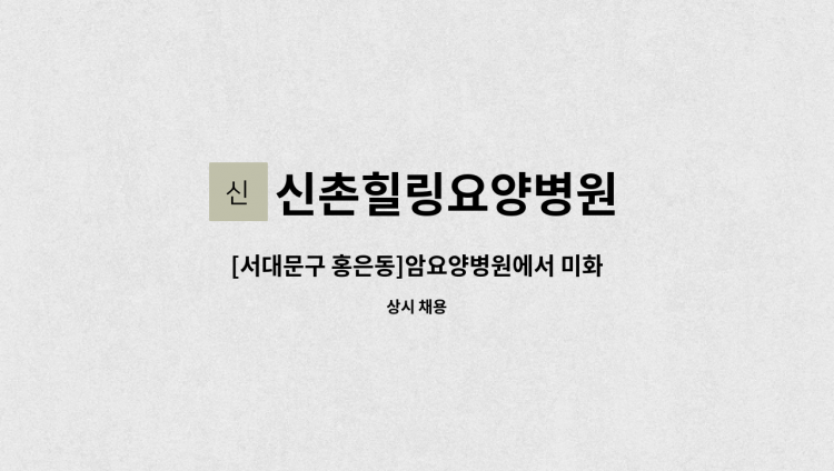 서대문구 홍은동에 위치한 암환자 요양병원입니다. 총 병상은 79베드이고 신촌세브란스 항암치료 하시는 환자분이 대상입니다. 현재 개원하여 운영중입니다. -1일 9시간 근무시간중 휴게시간 1시간입니다. -월 8일 휴무/ 연차 자유롭게 사용 가능 4대 보험, 건강보험, 국민연금, 고용보험, 산재보험, 퇴직연금, 퇴직금, 연차, 월차, 정기휴가, 경조휴가, 반차, 직원식당, 휴게실, 카페테리아, 숙직실 보유