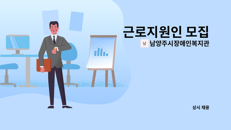 *구분: 사회서비스팀 *채용분야: 활동지원사업 전담인력 *인원: 1명 *업무내용: 장애인 활동지원서비스 연계 및 관리 등 활동지원사업 업무 전반 *채용형태: 계약직 *근무형태: 월 ~ 금요일, 9:00 ~ 18:00 *근무기간: 채용일로부터 1년 *공통필수자격: - 사회복지사업법 제35조의2 2항에 해당하지 않는 자 - 지방공무원법 제31조에 의한 결격사유에 해당하지 않는 자 *응시자격: [필수] 만 60세 이하로 다음의 어느 하나에 해당하는 자 - 사회복지사 자격증 소지자 - 비영리 민간단체지원법에 따라 등록된 장애인단체나 장애인복지 또는 사회복지를 목적사업으로 하는 기관에서 행정/교육/기관운영 업무에 3년 이상 근무한 경력이 있는 자 - 활동지원기관의 전담관리인력으로 3년 이상 근무한 경력이 있는 자 [우대] 장애인복지관 또는 장애인복지시설 경력자 *급여기준: 보건복지부 사회복지시설 종사자 인건비 가이드라인 *우대사항: 장애인, 국가유공자, 취업지원대상자