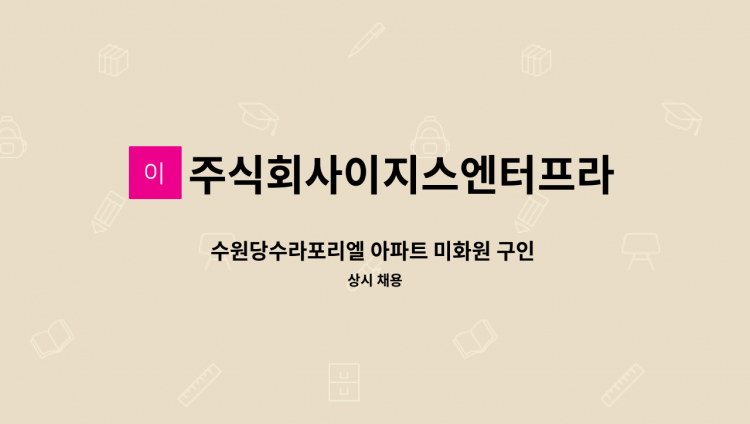 * 테크노폴리스 우방아이유쉘 아파트 미화원 모집 * 직무내용 : 아파트 청소 * 근무시간 : 미화원 - 월~금 08:00~15:00, 토요일(격주) 08:00~11:30 (휴게시간 12:00~13:00) * 급여조건 : 미화원 - 월157만원이상 * 5월17일부터 근무 가능하신 분 * 접수방법 : 팩스 (팩스번호 044-****-**** (*개인정보가 자동 블라인드 됩니다.))