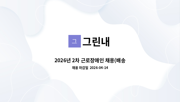 1. 모집분야 및 직무 : 배송보조 및 운반(화장지 제품 포장, 운반, 적재) 2. 자격요건 ○ 정년 만60세 ○ 학력 : 제한없음 ○ 성별 : 제한없음 ○ 장애인복지법 제 32조에 의거하여 장애인으로 등록된 분 ○ 범죄 및 성폭력범죄, 아동학대 전력 조회 시 결격사유가 없는 분 ○ 2023년 현재 주민등록등본 주소지가 서울시로 등록된 분(인근거주자 우대) 3. 근무조건 ○ 근무장소 : 서울특별시립 그린내 ○ 위 치 : 서울시 서대문구 명지2길 14 (홍은동 304-1번지) ○ 급 여 : 면접 후 협의 ○ 근무시간 : 오전 9시 ~ 오후 5시(근로 6시간, 휴게시간 2시간) 4. 응시원서 교부 및 접수 ○ 공고기간 : 2023년 5월 15일(월) ~ 2023년 5월 30일(화) ○ 접수방법 : 방문 후 초기상담 진행 후 접수(방문 시 사전연락 필수) ○ 상담기간 : 2023년 5월 16일(화) ~ 2023년 5월 30일(화) 오전10시~오후5시 5. 기타사항 ○ 공고기간 종료 후 현장평가일정에 대해 개별적으로 연락을 드립니다. ○ 지적 및 자폐성장애 지원자의 경우 필요시 보호자와 함께 면접이 진행될 수 있습니다. ○ 입사지원서는 본 기관 양식으로 지원하셔야 접수됩니다.