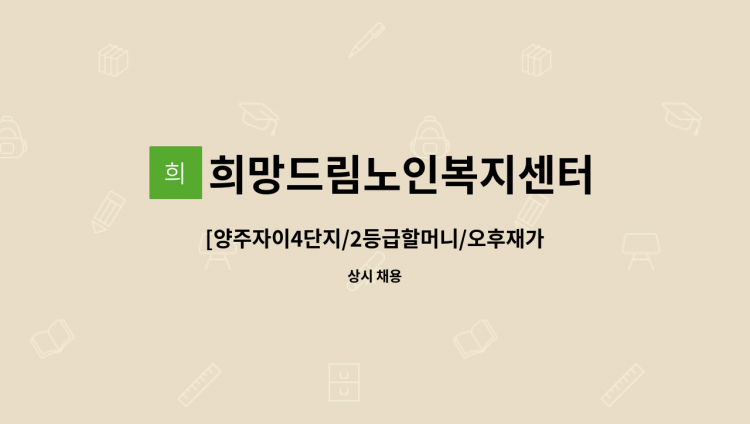 ▣ 상계동 재가요양보호사 모집 - 3등급 할머니, 독거, 거동가능 - 18:10~20:10(2시간) / 주 2~3일 - 청소, 반찬, 식사준비 등 요양보호사 전반적인 업무 - 시급 : 12.100원 - 채용담당자 031-****-**** (*개인정보가 자동 블라인드 됩니다.) 전화후 면접 진행해주세요.