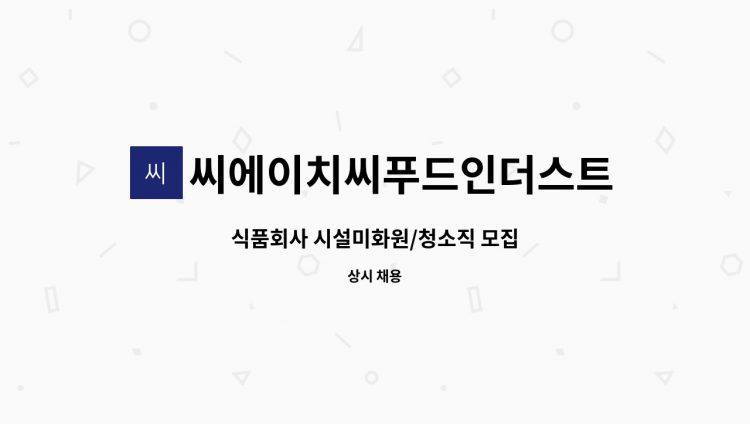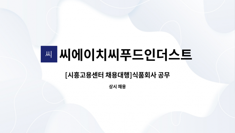 ![씨에이치씨푸드인더스트리즈(주) - [시흥고용센터 채용대행]식품제조회사 공무부 모집(설비유지보수, 기계설비 ) : 채용 메인 사진 (더팀스 제공)](https://www.theteams.kr/includes/uploads/recruit/씨에이치씨푸드인더스트리즈(주)_202305171.png)