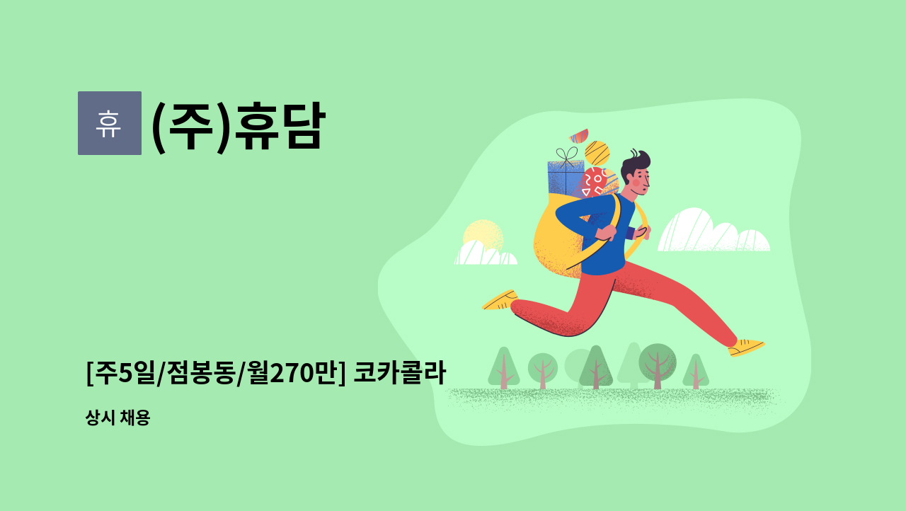 운전사원 및 배송보조 - 배송보조 : 2인 1조로 조수석에 탑승해 거래처(마트,식당,편의점 등)에 음료 배송보조 - 배송사원(운전원) : 2.5톤 차량 직접 운전해 음료 거래처 배송 (보조와 2인 1조 업무) - 면허 1종 + 운전직 까지 희망자는 배송보조 (수습 1~6개월 후) → 운전직 전환. -전환 시 코카콜라 자체 계약직으로 연봉 약 3500만원 이상 ★코카콜라 정규직과 동일한 복리후생 제공★ - 계약직 2년 후 정규직 전환 가능 근무시간 : - 08:00~18:00~30 근무요일 : 월~금 [주 5일 근무] 급여조건 : - 배송보조 : 세전 월 247만원 - 배송사원 : 연봉 3천 5백만원 이상 - 경력자우대, 휴학생 가능, 장기가능자 - 군필자 또는 면제자 - (신체상 결격사유 없는 경우)