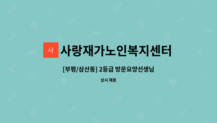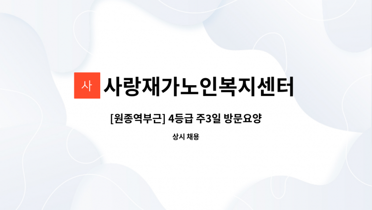 요양보호사 선생님을 모집합니다 -대상자 : 2등급 여자어르신 (기저귀케어X) -근무시간 : 09:00~13:00 ( 월~토 공휴일제외 월 26일 근무 토요일 근무 "필") 근무지 : 향남시범한우물마을 휴먼시아5단지아파트 -업무: 식사 도움, 일상생활도움, 가사지원, 목욕도움 등 어르신케어 -시급: 12,200원 지원및 문의 (부재시 문자로 성함과 사시는곳남겨주세요) 010-****-**** (*개인정보가 자동 블라인드 됩니다.) 인정유효기간: 23.03.21~26.03.22