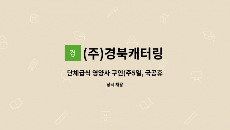 * 조리사 구인 1. 근무조건 : 주5일 근무 2. 근무시간 : 8:30~14:30 근무 3. 급여 : 1,570,000원(경력 3년이상 우대) 4. 자격증 : 조리 자격증 우대 (종류 상관없음) 5. 근무지 : 대구 동구 신덕로 124((주)백두F&S) 6. 단체급식 경력자/ 인근 거주자 우대 <대구동부고용센터 채용대행> * 지원방법 : 워크넷 구직신청 후 워크넷 입사지원으로 지원 ☎ 문의 : 대구동부고용센터 최가영 주무관 053) 667-6926