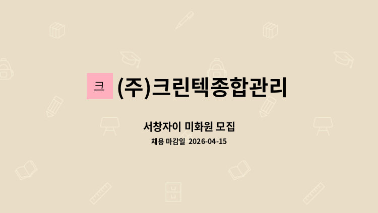 청라호반베르디움2차 아파트 미화원 모집 * 급여 : 1,630,590 * 수당 : 200,000 *지하주차장 탑승 차량 운전가능자 * 복지카드소지자 우대
