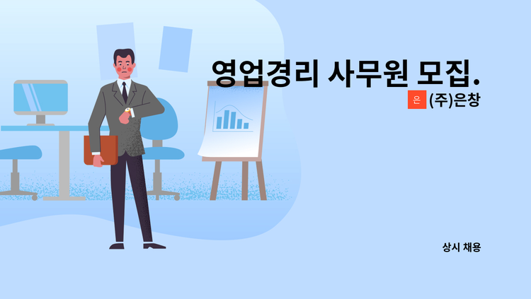 ≪(주)은창(영천시 고경면 소재 비닐포대 제조업체)에서 경리사무원을 모집합니다.≫ - 직무내용: 경리/총무/회계사무 전반 (해당업무 경력자) - 근무형태: 월~금(08:30~17:30)/ 조별 토요일 근무(08:30~17:30) - 급여조건: 면접 후 협의 - 지원방법: 이력서, 자기소개서 첨부하여 워크넷 입사지원 바랍니다.