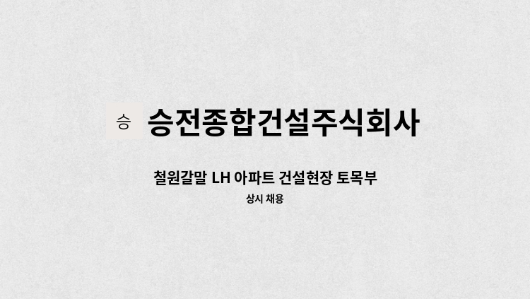 □ 위 치 충청북도 청주시 서원구 구룡산로 292 등 □ 채 용 -현장대리인 1명(공동주택 6년이상, 고급이상) - 공무 1명 (초급이상 가능) - 건축공사 1명(초급이상) □ 필수항목 -기술인협회 경력증명서 제출 □ 직 무 위 현장 관련업무 현장 총괄PM상주현장 □ 연 봉 (채용시협의가능) 연봉 : 3,500 ~ (협의) □ 휴 무 - 월 6일 (채용시 협의) * 공사 작업상 근무 시간은 협의 가능 * 24년 6월 말까지 채용 예정이나 공기 연장시 채용기간이 늘어 날 수 있음.