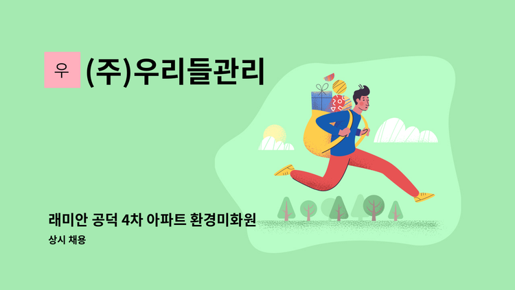 광명동 월드메르디앙 아파트 청소미화원 모집합니다. 주5일/월.화.목.금 08:00~17:00, 토 08:00~12:00/ 자차소지자(필수)/ 월급 190만원(170만원+20만원:차량유류비)