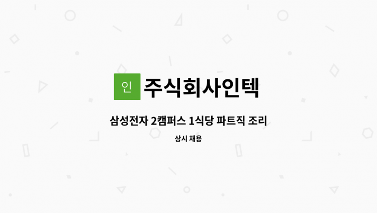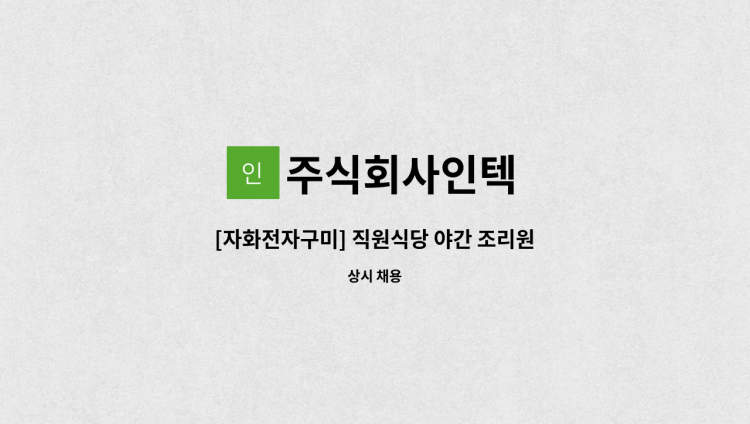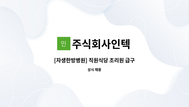 -조리보조, 전처리, 세척, 배식 등 -근무시간 09:00~20:00 주5일근무 / 스케줄휴무 -보건증 필수/ 장기근무 가능자 -경력무관(단체급식 유경험자 우대) -4대보험필수, 퇴직연금 및 연차(연차/개정연차) 별도지급, 각종 경조사 휴가 및 경조금 지급, 명절선물 지급 구미여성새로일하기센터 채용대행 건 입니다. *「이메일 입사지원시 필수 사항」지원시 워크넷 구직신청관리 하단부분의 □워크넷 공개 □정보조회 □여성새로일하기센터 3가지 동의(필수) 체크 후 전화지원 070-****-**** (*개인정보가 자동 블라인드 됩니다.)가능합니다.