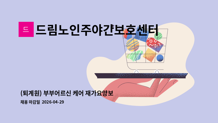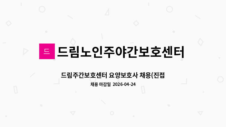 주야간보호센터 간호조무사를 모십니다. 주5일 근무 09:00~18:00 주요업무 - 어르신 건강관리 및 간호업무 - 간호관련 서류 작성 및 관리 * 운전 필수