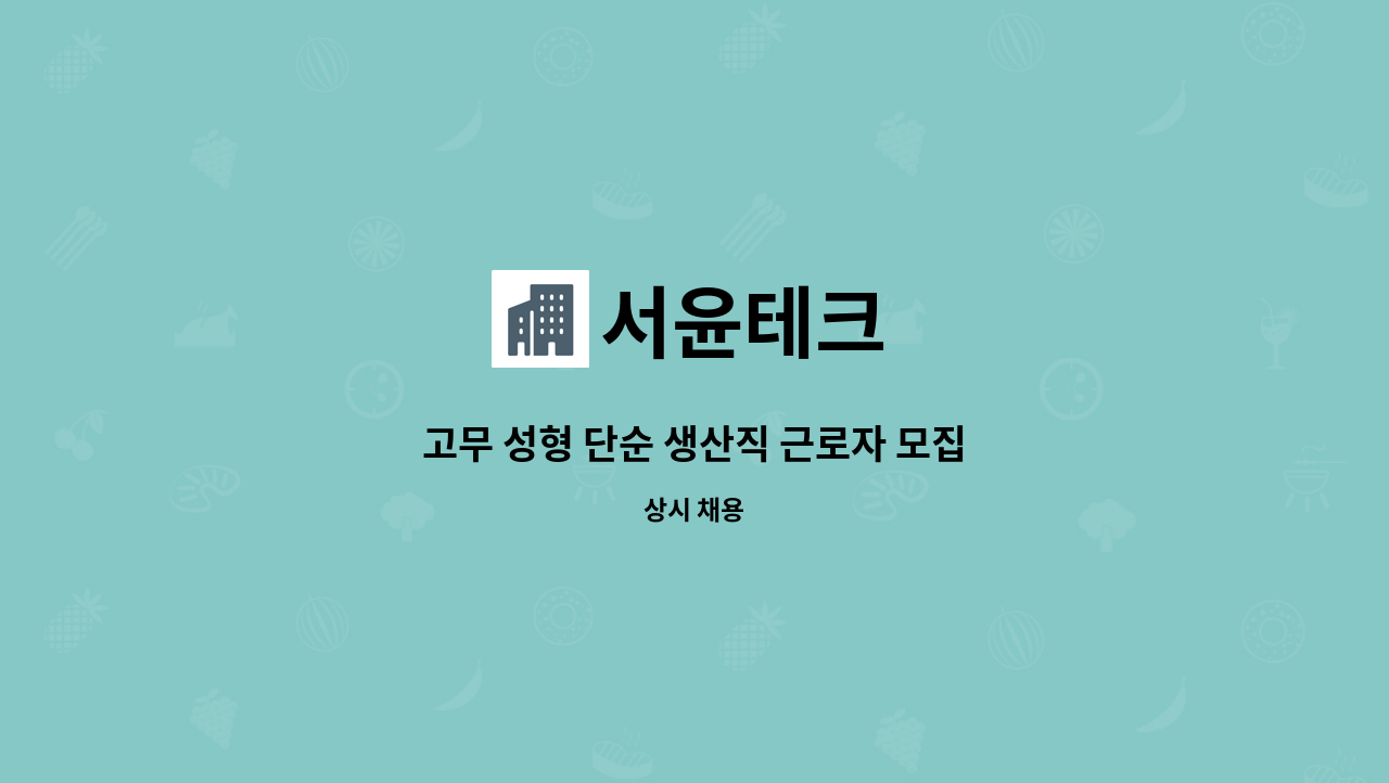 <<고무 제품 성형,접착 단순 생산자 구인>> - 고무 사출 압입을 통한 자동차 부품 생산 - 고무 사출 전단계 부품 접착제 도포 작업 (자동도포) - 플라스틱 및 금속 고무 성형 압출 제품 생산 통근버스,기숙사 운영