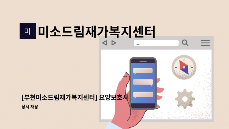 안녕하세요 부천 미소드림재가복지센터 입니다. 요양보호사 모집합니다. 책임감 및 친절하신 분 희망합니다. 3등급 할머니 - 일하시는 곳 경기도 부천시 부천로96번길 - 시간 오전 10시~13시(월~토) 자세한 사항은 지원 및 문의 부탁 드립니다.