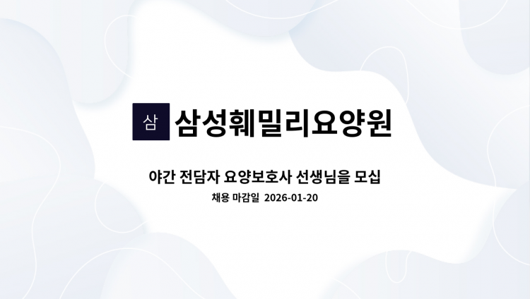 열정적인 요양보호사 선생님을 모집합니다.(야간근무1~2회, 신입 환영) 선생님들의 업무강도를 줄이기 위해 리프트기를 사용하고 있으며 쾌적한 휴게공간도 따로 마련되어 있고 신규선생님을 위한 교육도 적극적으로 진행되고 있으니 많은 지원 부탁드립니다. (주간 전담 선생님도 모집합니다.) 3개월 수습기간 있음. 근무시간은 07:30~17:40 (휴게시간 있음) 11:40~21:10 (휴게시간 있음) 20:40~익일 08:10 (야간근무1~2회)(휴게시간 있음) 많은 지원 부탁드립니다~^^ (전화 문의 환영)
