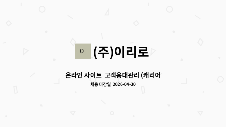 안녕하세요 저희회사는 온라인사이트에서 캐리어,벤큐,쿠첸 공식대리점을 운영하고있습니다. 취업하시면 차량용품소물 택배포장작업및 LED모니터 용산상가內 도보배달업무를 하실예정입니다. 4대보험가입가능하고 휴일및토요일은 전부 쉽니다. 근무시간은 7시간30분입니다. 온라인영업에 관심이 있는분들에게는 영업에 관한부분도 전수해서 추후 온라인직원으로 근무하실수있는 혜택도 가능합니다. 많은 분들의 지원 부탁드립니다.