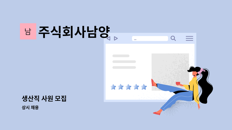 남양은 랩을 생산하는 공장입니다 -생산공정은 자동화 상태에 있읍니다 -하실일은 원료를 공급하고 -나온 랩을 포장하는 일입니다 -지게차를 움지일수 잇는 자격증이 있으면 우대하나 못하셔도 상관없읍니다