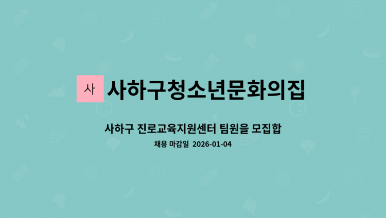 <통합방과후학교 사업보조 및 안전지도 인력> 1. 지원자격 및 우대사항 - 보육교사 및 방과후학교지도자 우대 - 어린이집, 유치원, 학원차량 안전동승자 경력 우대 - 청소년관련 자격증 소지자 우대 - 무경력자 지원가능 2. 직무내용 - 통합방과후학교 어린이 보호차량 동승 및 탑승 청소년 안전관리지도 - 통합방과후학교 출결, 영수증 처리, 서류정리 등 업무 보조활동 - 기타 기관에서 지정한 업무