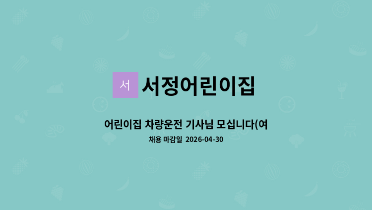 안녕하세요. 어린이집 버스 운전해주실 기사님을 모집하고 있습니다. 1.접수방법: 이메일 접수([email protected]) 이메일 접수가 어려우시면 원으로 연락주세요. 2.필수조건: 대형면허 소지자 3.근무조건: 어린이집 등,하원 차량을 운전해주시는 업무이며 오전,오후 등하원 시간에 따라 3시간 정도 근무함 명절 상여금 지급