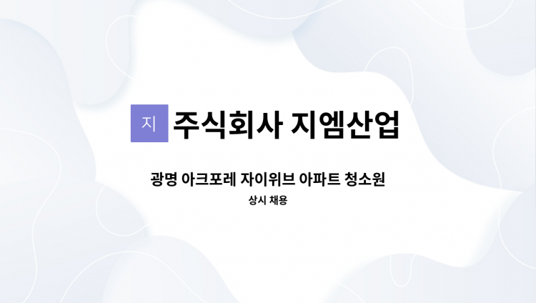 - 모집인원 : 외곽청소 1명 /내부미화 1명 - 근무시간 : 주6일 33시간 (08:00~15:00 , 토 08:00~11:00) - 급여 : 외곽 1,721,270원 내부미화 1,671,270원 - 근무지 : 광명시 새터로 44-8 광명아크포레 자이위브 아파트 - 복지카드 소지자 우대