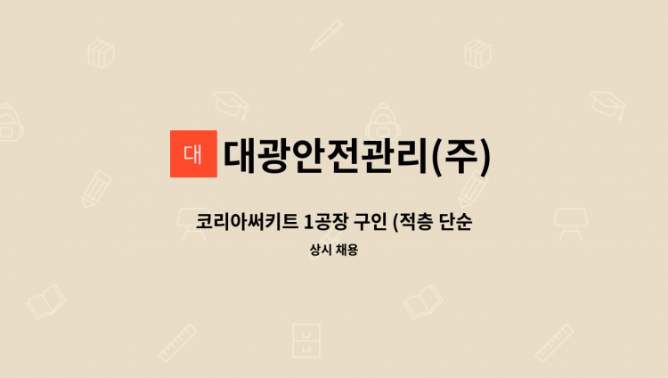 ▶ 직무 : 공장 내부 청소 (기계 등) ▶ 조건 : 8:30~17:30 / 주5일 ▶ 급여 : 월 209만원 (잔업, 특근 수당 별도) ▶ 근무지 : 강촌로139번길 9 (코리아써키트 1공장) ▶ 통근버스 이용 가능 / 중식 제공 / 공휴일 휴무