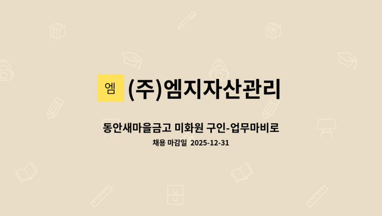 - 건물내 청소 및 미화업무 - 실 근무지 : 경기도 안양시 동안구 관양동 1121-4 동안새마을금고 - 근무시간 : 07:00 ~ 15:30 - 일 7.5시간 근무 / 주 37.5시간 / 휴게시간 1시간 - 월 1,932,560 원 / 연차수당 별도 모두 지급