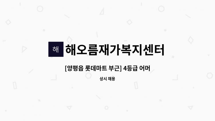 ▶ 재가요양보호사님 구인 [요양지원] - 대상자 : 3등급 아버님 - 근무시간 : 오전 09시~12시 (시간 조정 가능) - 주 업무 : 식사준비, 정리 정돈, 정서지원 서비스 등 - 근무지 : 경기도 양평군 양평읍 안경공간 건물