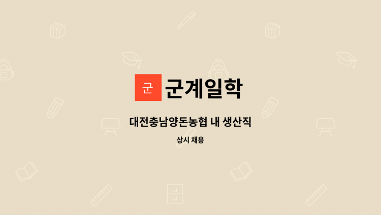대전충남양돈농협 내 주식회사 군계일학 소 도축 업체 입니다. 생산 직원 모집중입니다. 쾌적한 환경 입니다. 신입 가능하고 경력자 인정해 드리니 많은 지원 부탁드립니다.