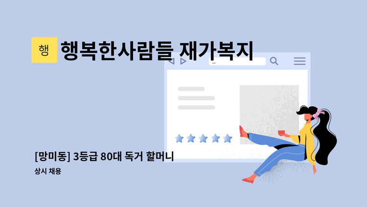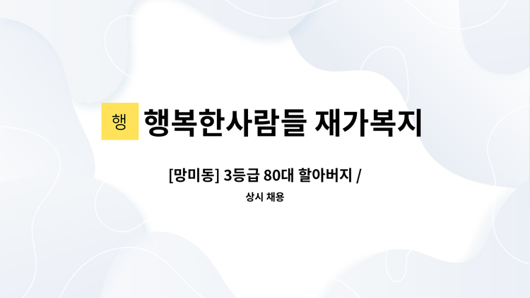 [ 남천동 코오롱하늘채 ] 재가요양보호사 선생님 모집합니다. - 4등급 여자어르신 - 09:00~12:00(3시간) / 주5일 - 시급: 12,400원 - 일상생활지원 등 요양보호 업무 / 신입 가능 - 채용담당자 : 010-****-**** (*개인정보가 자동 블라인드 됩니다.) [ 행복한사람들 재가복지센터 ]