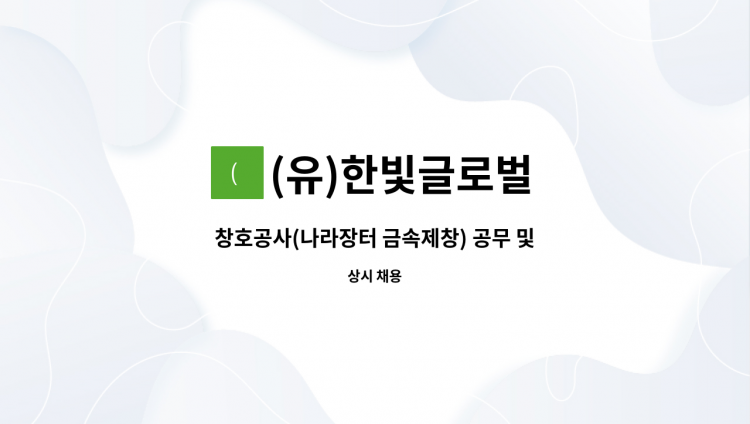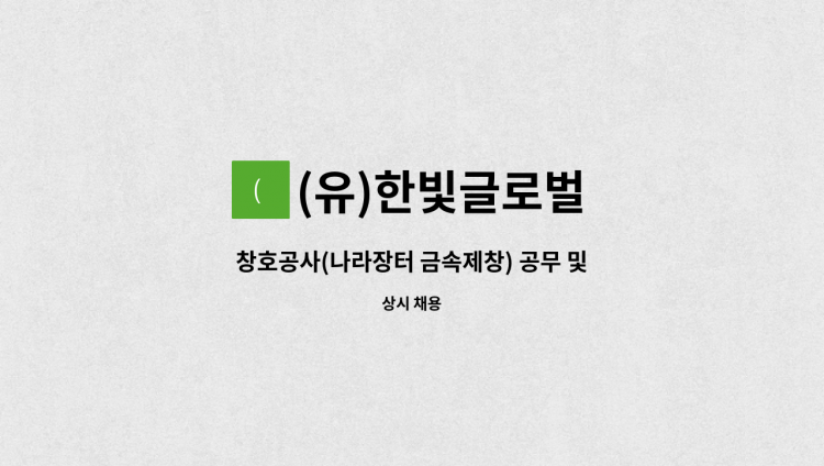 당사는 창호 제작 및 시공을 주사업으로 하는 기업입니다. 관공서,학교,체육관 등 공공기관에 납품하는 관급공사가 매출액의 95%를 이루고 있습니다. [모집분야] 공무(조달청 창호)업무 경력직 모집 [주요업무] - 조달청 창호 공무 업무 수행 - 현장 조달 업무 관리 및 지원 - 협력사 및 관급공사일정 관리 [급여제도] - 면접 및 협의후 결정(경력에따라 상이) [자격요건] - 창호 관련 업무 경력자 우대 - 컴퓨터 활용 능력 보유 - 현장 업무에 대한 이해 - 소통 및 협력 능력 [우대사항] - 관련 자격증 소지자 - 협력사 업체 관리 경험 - 현장 업무 관련 교육 수료 - 4년제 공과대학, 자연계대학 졸업자 우대 [복리후생] - 급여 : 명절상여금, 퇴직금 - 리프레시 : 휴가비지원, 생일선물 - 4대보험 가입 - 연차 및 경조휴가 제공 *2차면접은 상황에따라 생략될 수 있습니다