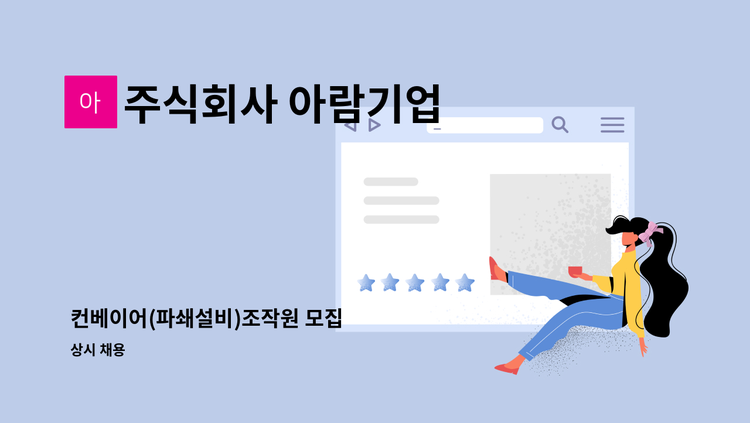 컨베이어(파쇄기) 조작원 모집 업무내용 : 단순 직종 (컨베이어 앞에서 흘러내리는 슬라그에서 잔고철 분리 작업 진행) 업무시간 : 07:00 ~ 17:00 (점심 1시간 휴식) 급여 : 시급제 ( 10,000 ~ 11,000) 우대사항 : 신체 건강한 자.