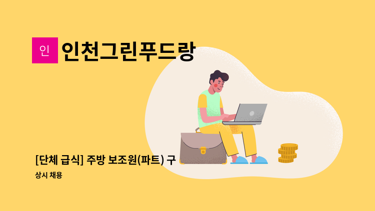 * 보조 조리원 구인 1명 -조리원 업무 1.근무 시간 : 9시00분~15시00분 (휴게시간 30분, 일찍 마무리 시 일찍 퇴근 가능) 2. 직무 내용 : 전처리와 세척, 주방 기타 업무 (주방 정돈 및 홀 청소)등 3. 식수 운영(평일) : 평균 1일 식수 100~140식(중식만 운영) 4. 급여 : 160만원(연장 근무 시 별도)