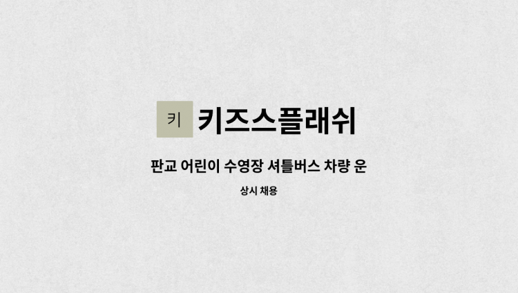 [모집조건] - 담당업무 : 어린이 수영장 학원차량 운전및 케어담당업무 - 경력여부 : 무관 - 고용형태 : 계약직 - 학력 : 무관 - 우대·기타조건 : 인근거주자 [근무조건] - 급 여 : 월급 1,900,000원 - 근무기간 : 12개월 - 근무요일 : 월~토 - 근무시간 : 13:00 ~ 21:00 (토요일 09시~14시까지) - 근무지 위치 : 경기 성남시 분당구 대왕판교로 660 유스페이스1 - 복리후생 : 국민연금, 건강보험, 고용보험, 산재보험, 퇴직금 [접수기간 및 방법] - 지원방법 : 온라인지원, 이메일지원, 문자지원, 전화연락 - 제출서류 : 이력서