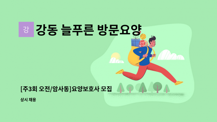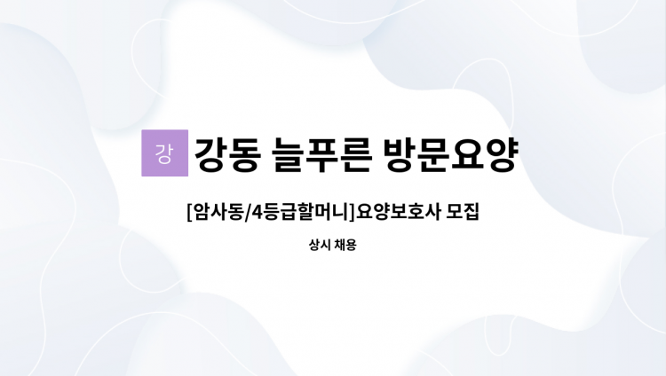 -요양보호대상자: 5등급 할머님(부부거주) -근무지: 강동구 암사동 -근무시간: 9-12시(주5일) -직무내용: 일상가사지원, 신체활동지원 -장기요양급여: 시급12,400원(주휴 및 연차수당 조건충족시) -문 의: 02-****-**** (*개인정보가 자동 블라인드 됩니다.)
