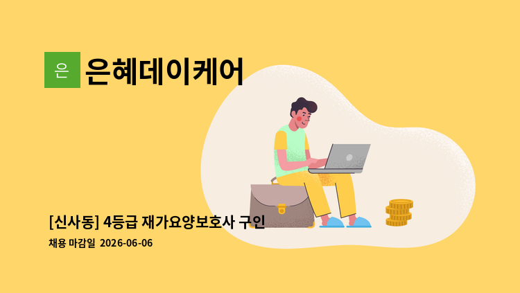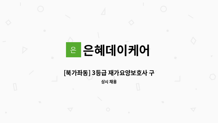 - 직무내용: 데이케어센터 간호업무 및 어르신 케어, 프로그램 진행보조, 송영업무 - 근무시간: 09:00~18:00(순환근무) - 급여: 월급 2,060,740원 - 근무지: 은평구 서오릉로31 2층(녹번동)