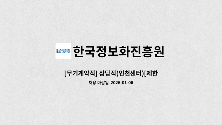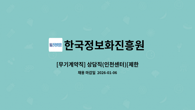 - 업무: 제주글로벌센터 경비 업무(감시단속적 근로자) - 인원: 2명 - 직군: 무기계약직 운영직(경비) - 기타사항: 채용 공고 참조, 정년기준에 의거 만 65세 미만 지원가능 - 근무시간 : 08시 ~ 익일 08시(14.5시간), 휴게시간 : 5회~6회(회당 : 1시간 이상, 9.5시간) - 자격: 관련법령에 의거 경비원 신임교육 이수자 또는 임용전 이수가 가능한자, 신임교육 면제자 [경비지도사 자격 소지자, 군인(부사관 이상), 경찰공무원 경력자, 대통령 등의 경호에 관한 법률에 의한 경호공무원‧별정직 공무원 경력자)만 지원 가능.] 기타 자세한 사항은 채용 홈페이지 공고를 참고하시기 바랍니다. https://nia.recruiter.co.kr/app/jobnotice/view?systemKindCode=MRS2&jobnoticeSn=196564