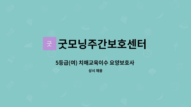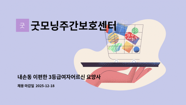-4등급 여자어르신 / 1명 -직무내용 : 어르신 케어, 청소 및 정리정돈, 산책(걷기운동), 화장실 이용 도움,목욕도움 -근무지 : 의왕시 평의길 48 호수마을 -근무일 : 월~금 5일(15시간) -근무시간: 오후 13시00분~오후 16시00분까지 (3시간) -시급 9,860원+ 각수당포함 : 12,300원